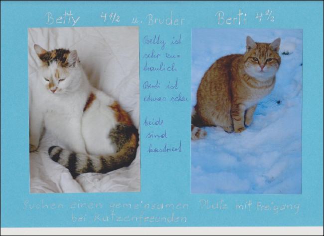 Die beiden kastrierten 4-jährigen Katzengeschwister Betty (weibl) und Berti (männl) suchen einen gemeinsamen Platz mit Freigang bei Tierfreunden.Betty ist sehr zutraulich, Berti etwas scheuer.Nähere Infos unter der Telefonnummer 07943/396